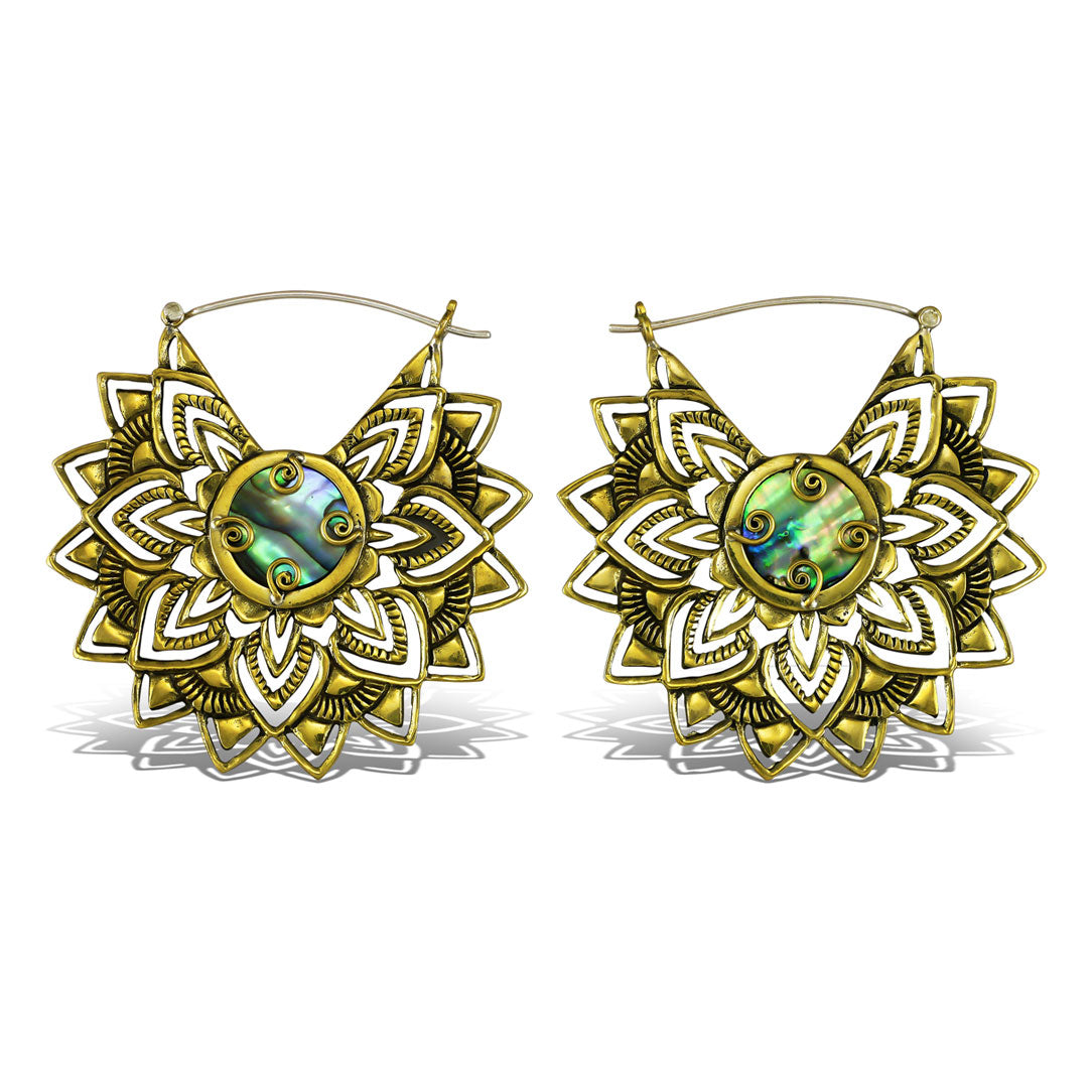 Handmade from high quality brass, these earrings are shaped into designs that are inspired by nature and Hindi culture. The lotus, spiral, flower of life and mandala symbols that are integrated to create these earrings are found throughout Hindi art and spiritual practice. The Abalone shell from New Zealand is typically a beautiful mix of purple, green, blue and pink. The 18ga sterling silver posts fit standard sized pierced ears.