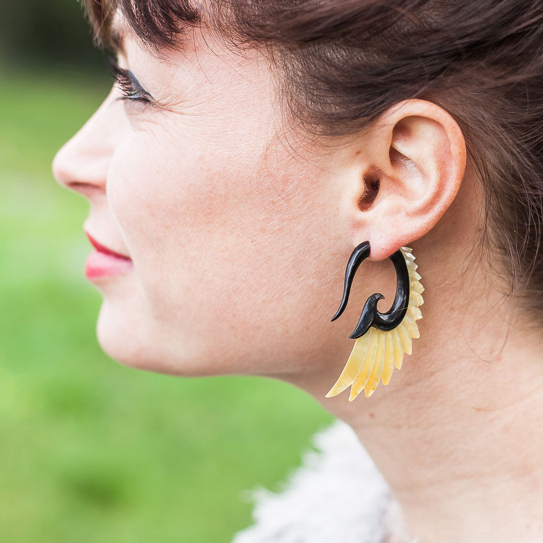 The salvaged horn used to hand-carve these earrings comes from a domesticated water buffalo used for cultivation and food. To minimize waste, they are respectfully utilized for this form of art and income. The black colored horn has a vibrant polished shine, is light in weight and very durable. Due to the natural characteristics of the material some slight variations in color may occur. The 19ga surgical steel post is 100% hypoallergenic.