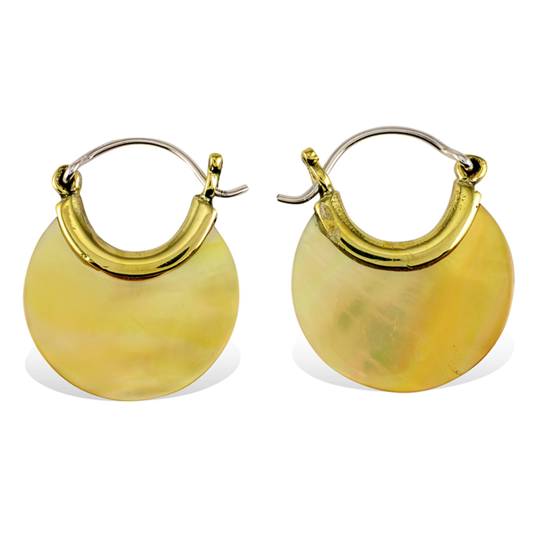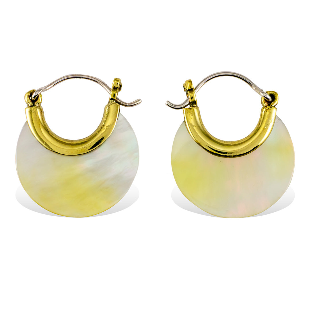 Inlaid in brass, these earrings are hand carved from shell originating from New Zealand. Due to the natural characteristics of the shell some variations in color may occur. The 18 gauge sterling silver posts fit standard sized pierced ears.
