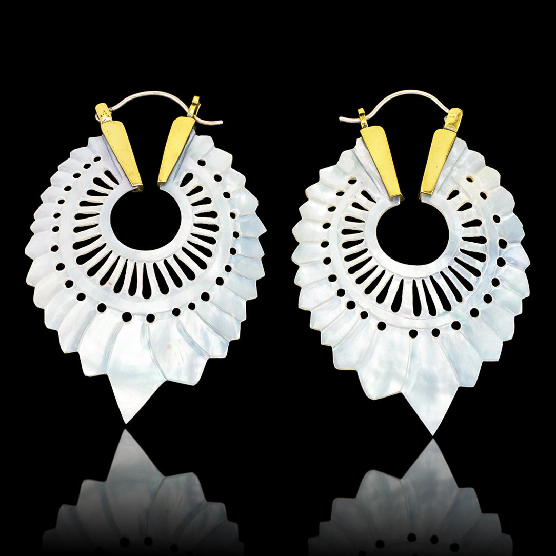 Inlaid in brass, these earrings are hand carved from shell originating from New Zealand. Due to the natural characteristics of the shell some variations in color may occur. The 18 gauge sterling silver posts fit standard sized pierced ears.