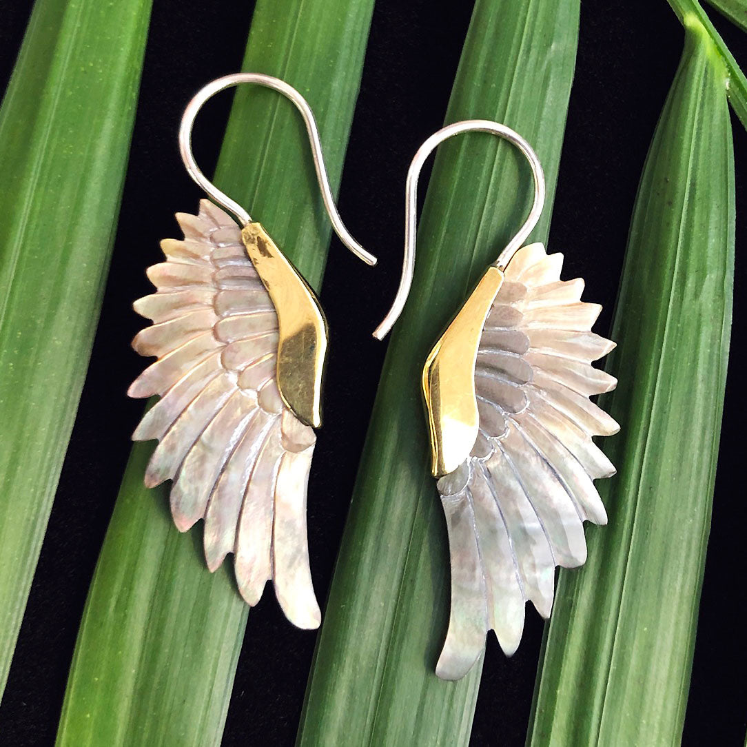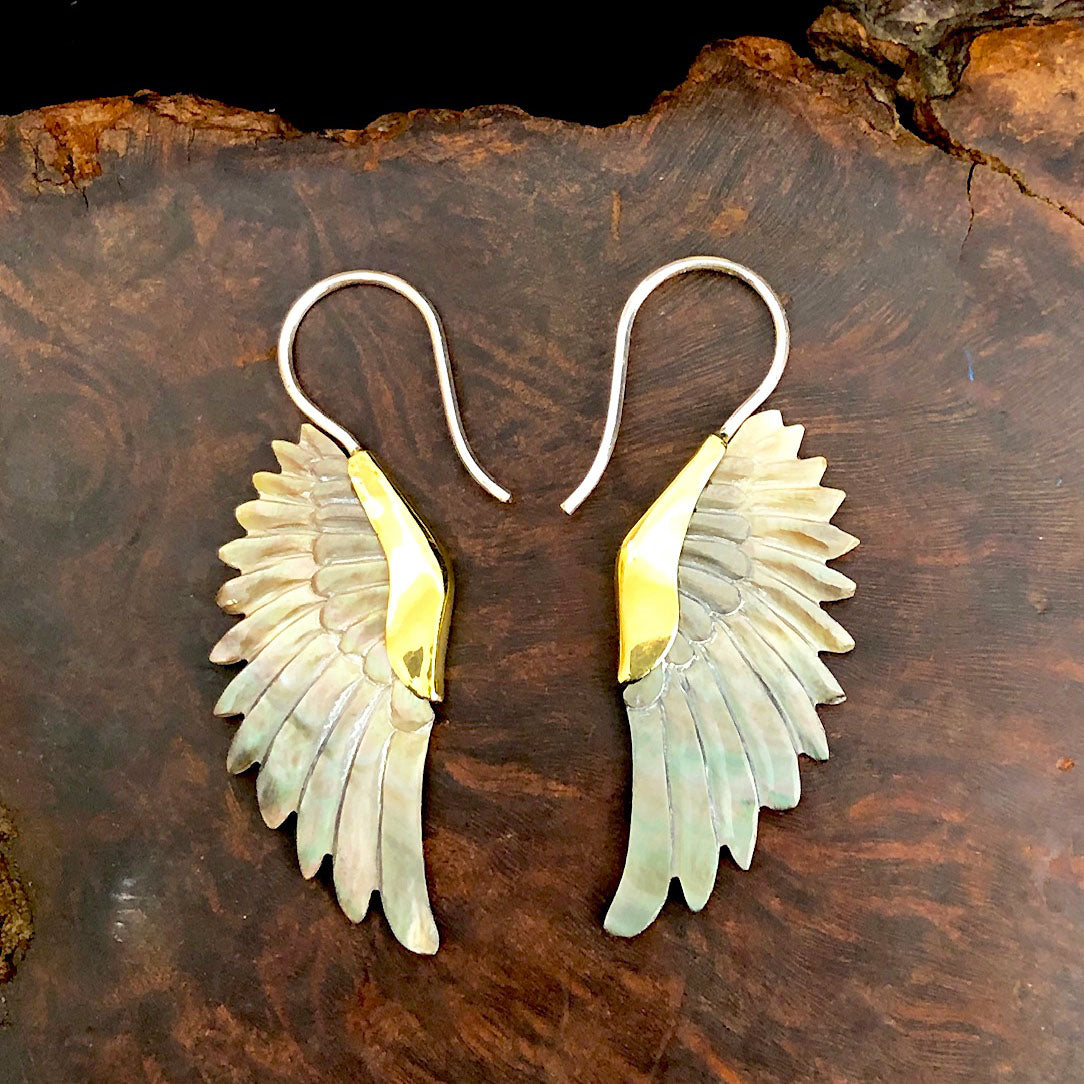 Inlaid in brass, these earrings are hand carved from shell originating from New Zealand. Due to the natural characteristics of the shell some variations in color may occur. The 18 gauge sterling silver posts fit standard sized pierced ears.