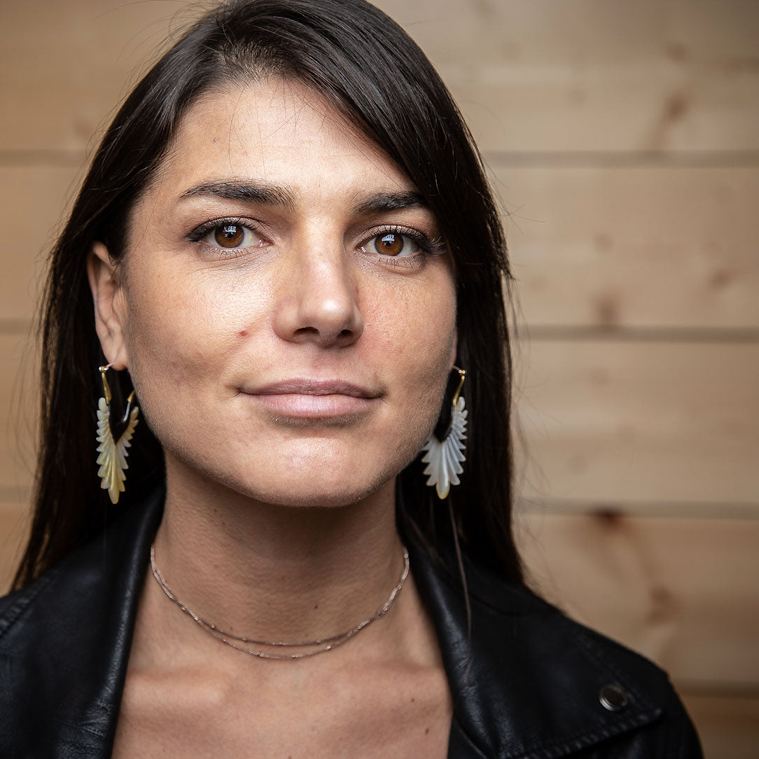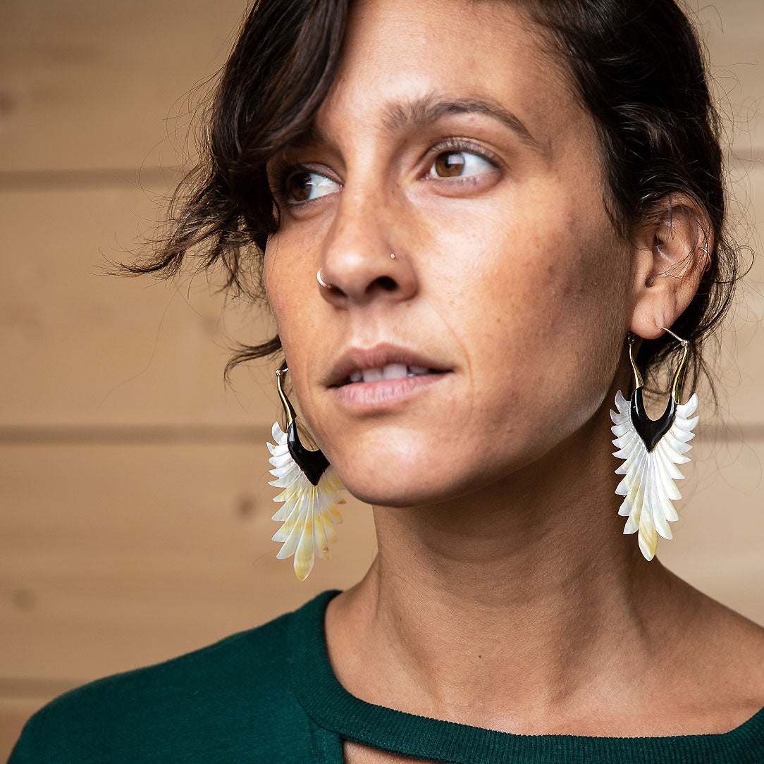 Inlaid in brass, these earrings are hand carved from shell originating from New Zealand. Due to the natural characteristics of the shell some variations in color may occur. The 18 gauge sterling silver posts fit standard sized pierced ears.