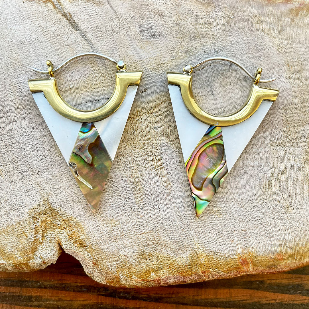 Inlaid in brass, these earrings are hand carved from shell originating from New Zealand. Due to the natural characteristics of the shell some variations in color may occur. The 18 gauge sterling silver posts fit standard sized pierced ears.