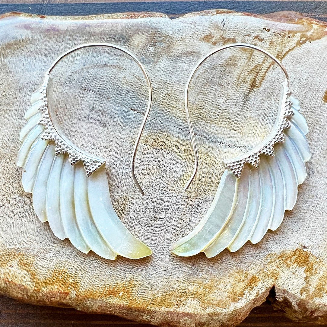 Inlaid in silver plated metal, these earrings are hand carved from shell originating from New Zealand. Due to the natural characteristics of the shell some variations in color may occur. The 18 gauge sterling silver posts fit standard sized pierced ears and come with earring backings.